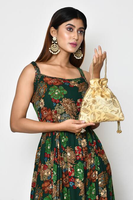 Metal chain handles, Dimensions: L x B (in inches): 9 x 10, Closure: Pull-out tasselled dori, Note: Outfit worn by the model is not for sale
