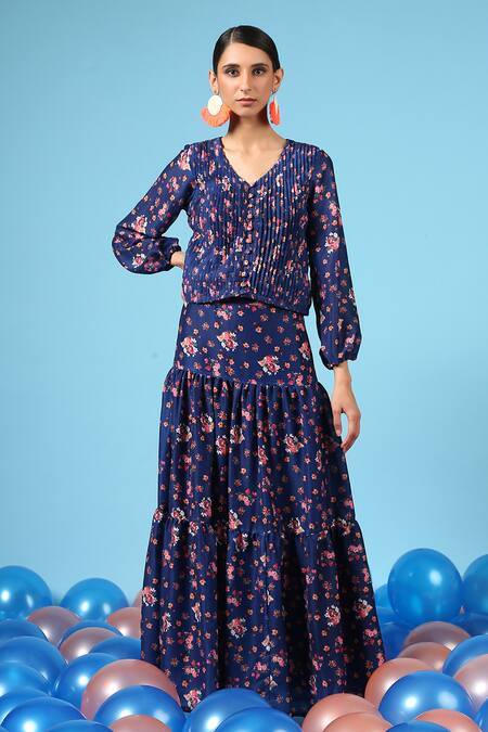 Blue cotton silk top with floral digital print, pleats, pintuck & button up detailing and puffed sleeves.