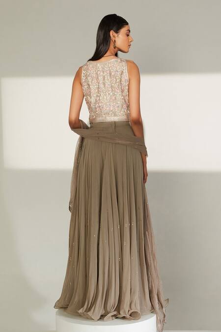 Rice brown padded jacket with floral embellished & couture embroidery. Paired with flared skirt with attached cancan & dupatta.