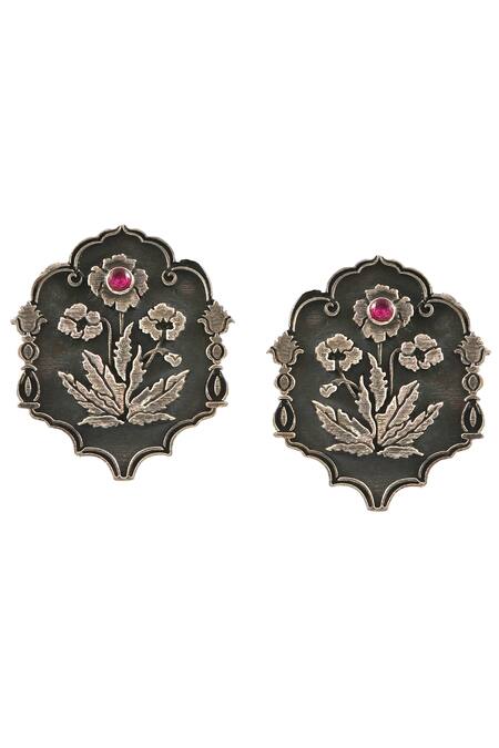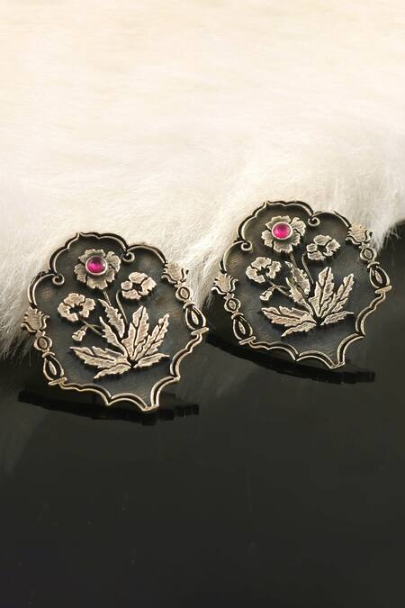 92.5 sterling silver stud oxidized earrings with floral design & carved detailing.