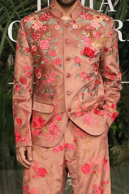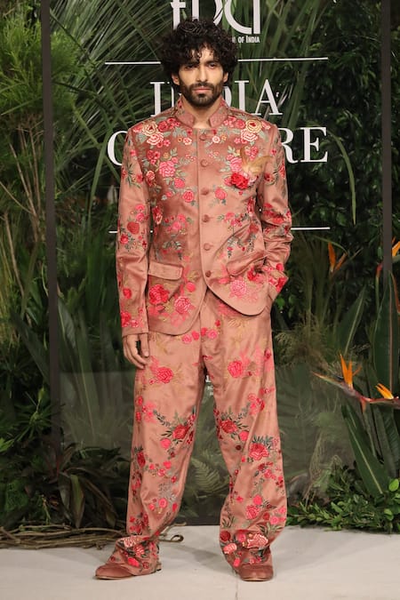 Old rose pink bandhgala featuring multicolor resham floral embroidery and a mandarin collar. Paired with wide-leg trousers that have side pockets.