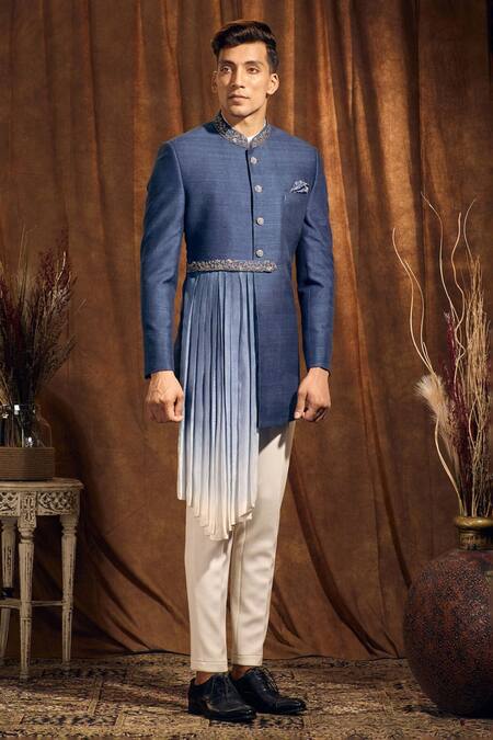 Blue raw silk bandhgala featuring floral embroidery and an ombre drape on an attached belt