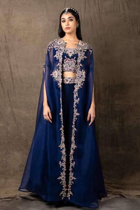 Blue organza open front cape with floral embroidery on the edge and cutwork detail. Comes with blouse and circular pants.