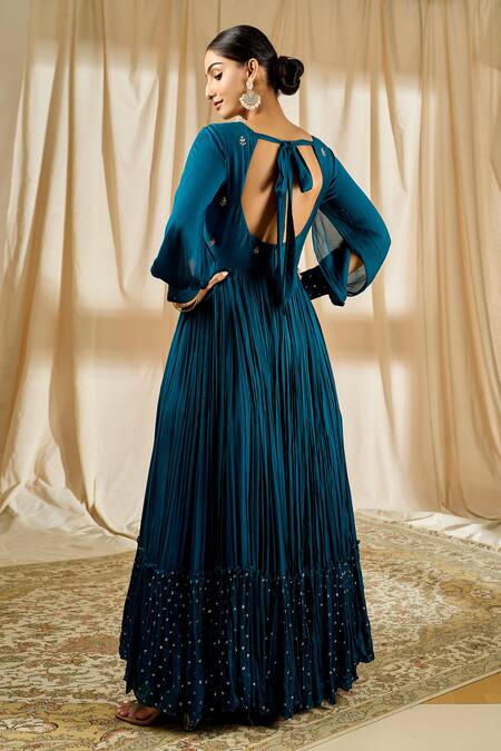 Teal blue chanderi gown featuring floral hand embroidery, blunt V neck, and balloon sleeves