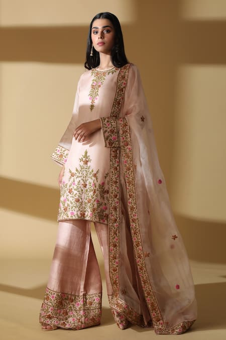 Pink kurta with floral embroidered motifs. Paired with flared pant & dupatta.