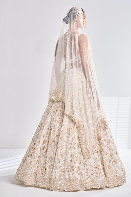 Cream Organza Sequin, Beads, Crystals And Floral Embroidered Bridal Lehenga Set