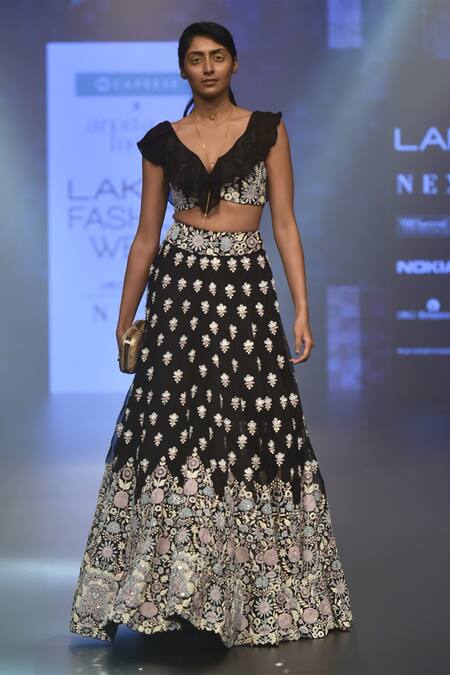 Black lehenga with all-over floral motif work. Comes with blouse enhanced with ruffle overlay.