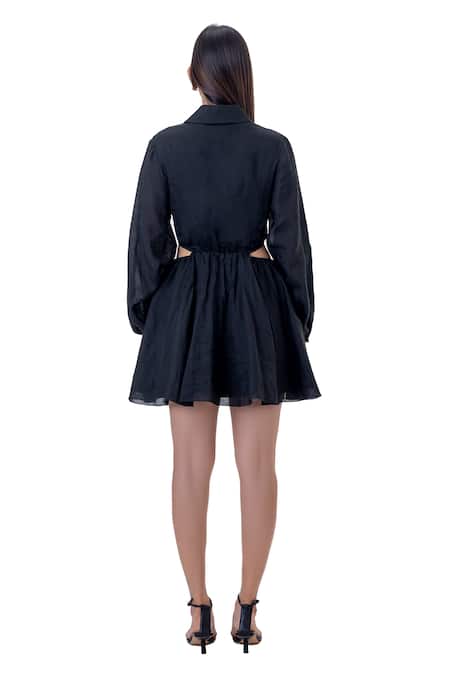 Black linen mini dress with floral embroidery and cut-out waist detailing.