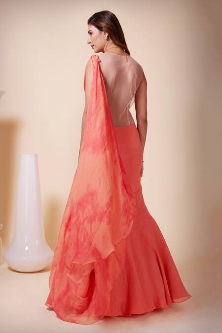 Coral saree gown featuring an illusion boat neck and sleeveless design