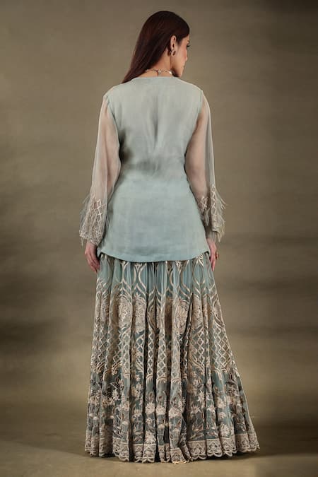 Powder blue organza kurta featuring embroidered sleeves and tassel details. Paired with a heavily embroidered 18-Kali sharara and an embroidered organza dupatta.