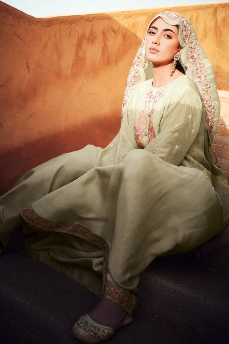 Green kurta featuring floral embroidery with button placket detailing. Paired with a matching sharara and embroidered dupatta with tassel edges.
