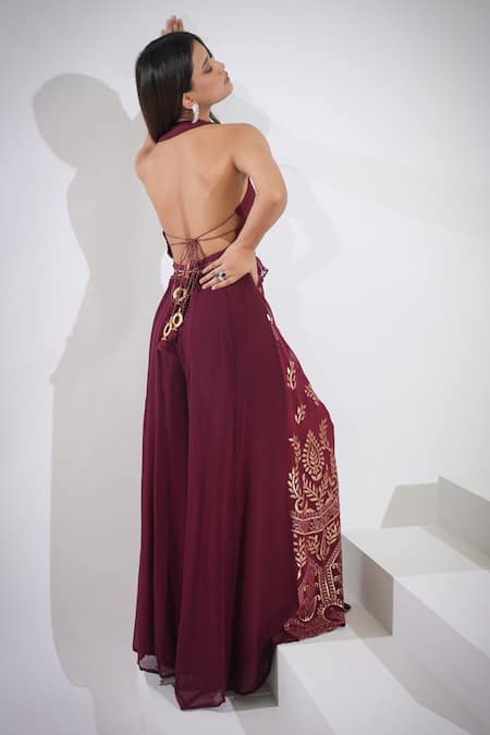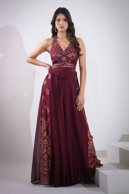 Beetroot peplum top with floral, chevron embroidery. Paired with gota embroidered palazzo.