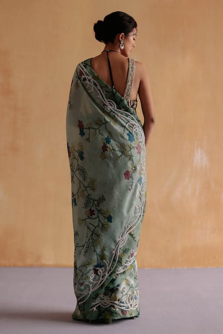 Aqua kalamkari saree crafted from handwoven light silk and organza silk, featuring a hand painted floral design and zardosi embroidery. Accompanied by a heavily embroidered sleeveless bralette with a V neckline.