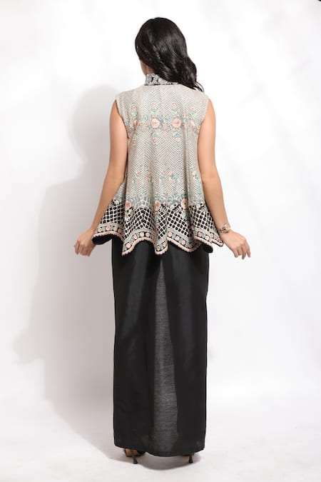 Black pant paired with a round neck embroidered bustier and a turquoise woven silk jacket featuring floral pattern resham embroidery. The jacket has a stand collar, cut work hem, and crystal drop tassel details.