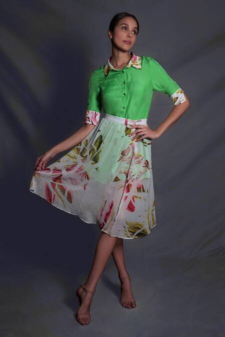 Green Crepe, Silk Embroidery Collared Floral Pattern Shirt Dress