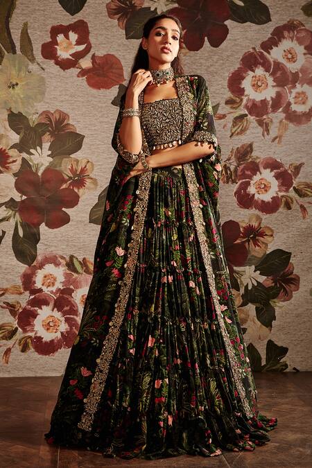 Multi-colored georgette maxi skirt with floral print, including sequins, nakshi, mirror, dabka, mukaish, moti, coin, and shell tassels hand embroidery. Comes with a blouse and a cape.