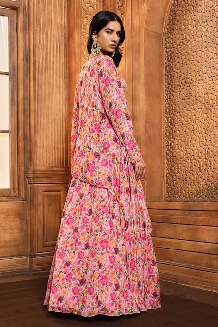 Pink floral print cape featuring mirror and thread embroidery. Paired with a padded bustier top and a printed drape skirt.