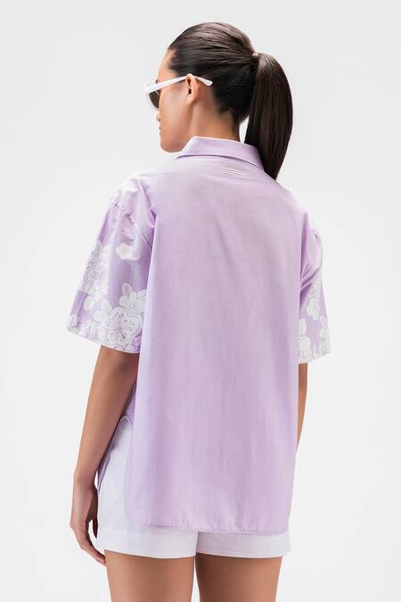 Purple shirt featuring a Cuban collar and short sleeves with floral printed motifs