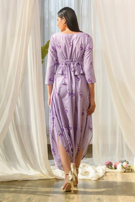 Purple dhoti style jumpsuit featuring a round neckline and long sleeves