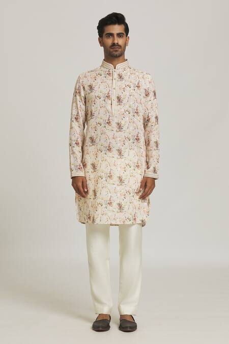 Beige Ruby Silk Printed Floral Kurta And Aligadi Pant Set