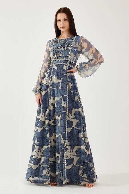 Blue Chiffon Embroidery Round Neck Floral Print Maxi Dress