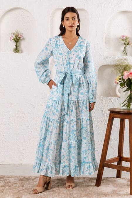 Light blue floral print maxi dress with tiered detail & cuff sleeves. Paired with tie-up belt.