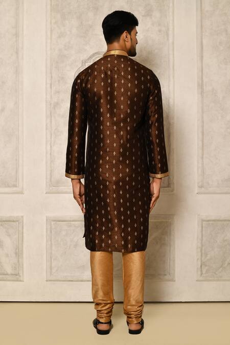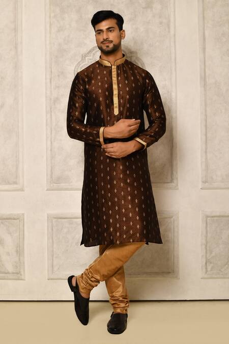 Brown kurta with floral prints and contrast border on neckline, placket and sleeves. Paired with chiku churidar.