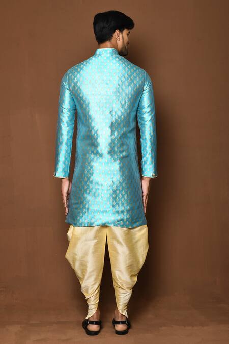 Sky blue sherwani with floral patterns and a welt pocket. Comes with a fawn plain patiala.