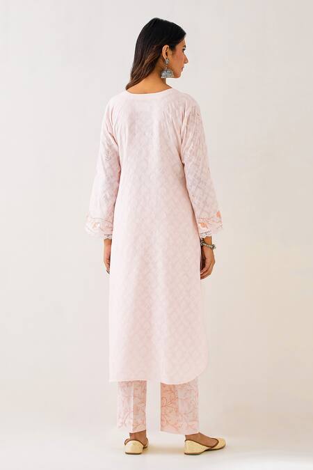 Pink Cotton, Jacquard Embroidery Split V-neck Floral Yoke Kurta