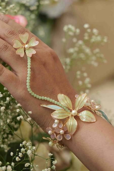 Buy_Floristaa by mahek_Multi Color Pearls, Stones Riva Floral Metallic Earrings Hathphool Set_at_Aza_Fashions