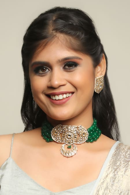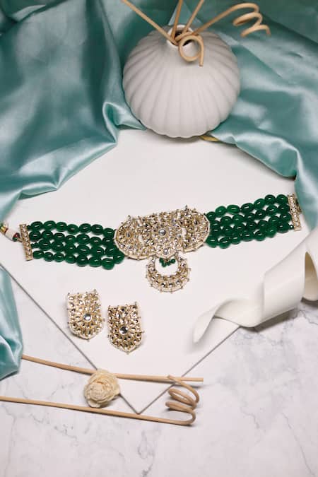 Gold tone choker necklace featuring geometric carved pattern with stone embellishments and green beads. Paired with matching earrings designed in a similar floral motif.
