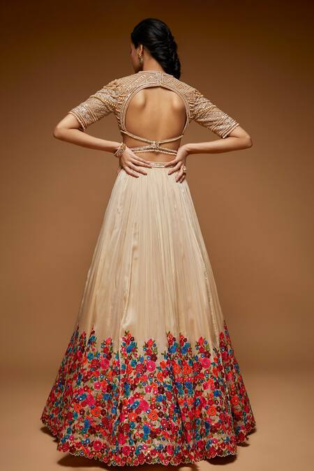 Beige A-line flare attached can-can lehenga with contrast floral vine embroidery on the hemline with resham and sequin embellishments. Paired with a half sleeve padded blouse with all over pearls & bead embroidery. Comes along with a dupatta.