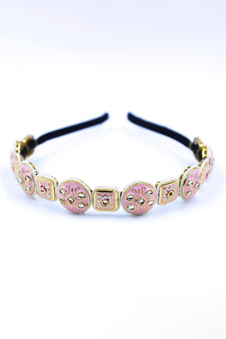 Gold and pink abstract carved cutwork brooch hairband featuring bead and crystal embellishment