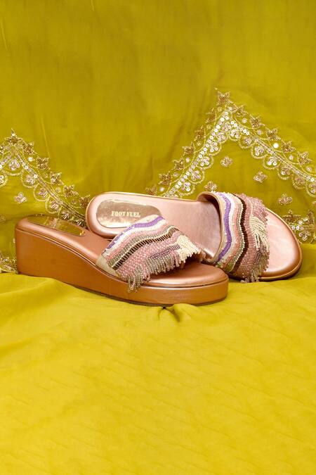 Gold platform wedges featuring cutdana and bead embellishments with tassel detail