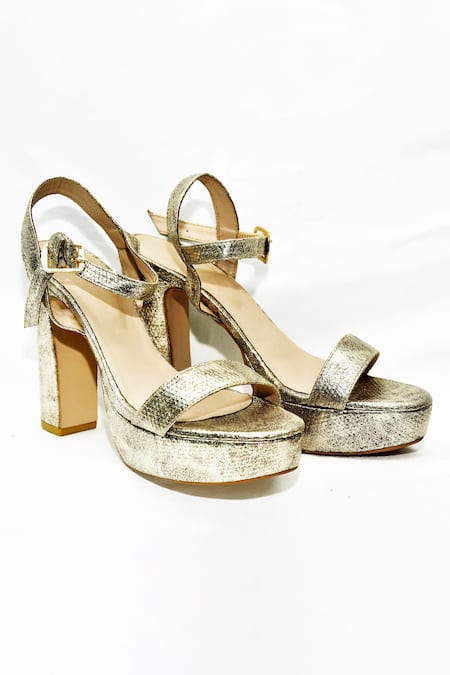 Gold block heels featuring a checkered textured pattern, ankle buckle straps, and round toe detailing