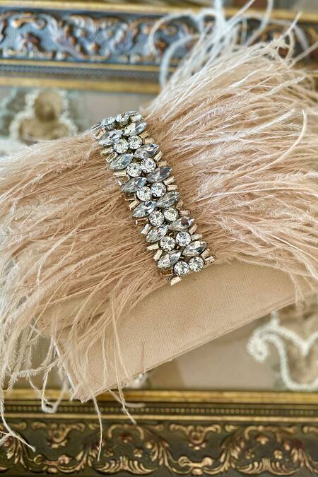 Beige velvet clutch with fringe feather trims, stone embellished envelope flap & beaded handle. Comes with sling chain.