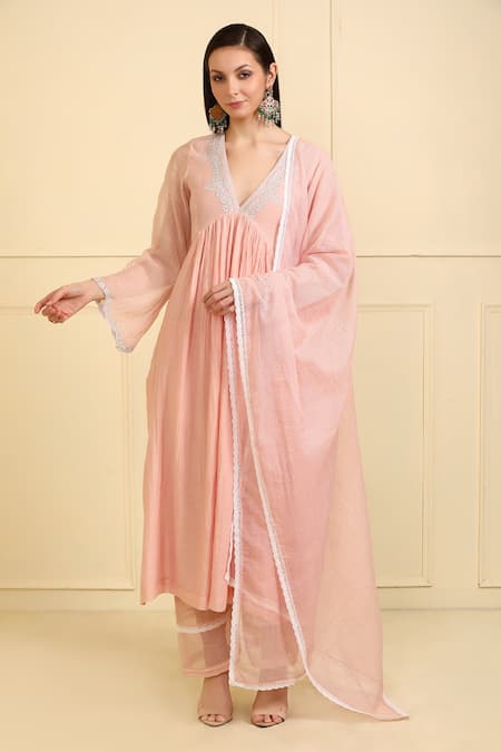 Pink kurta featuring contrast floral embroidery on the neckline and sleeve hems. Paired with matching pant and a dupatta with scallop lace border.