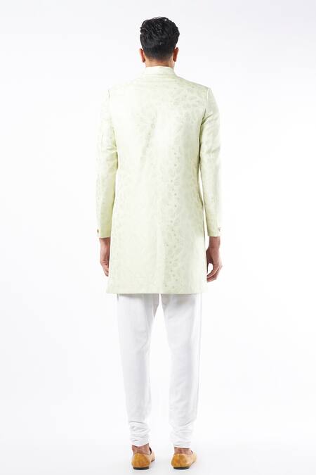 Mint green sherwani with mandarin collar & floral pattern. Paired with a white churidar.