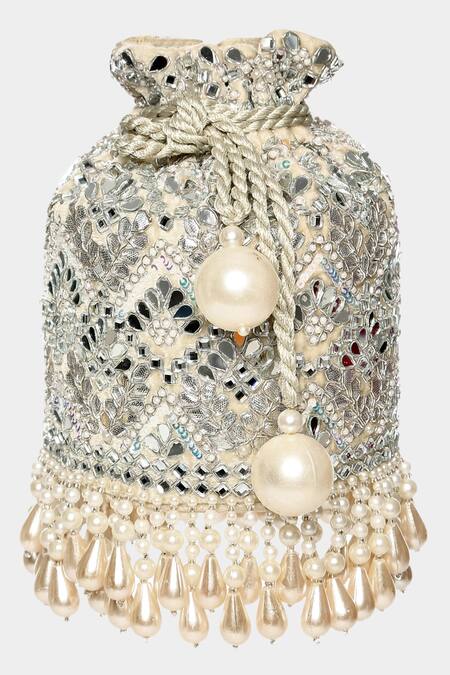 Buy_Aanchal Sayal_White Pearls, Sequins Gabriella Velvet Bucket Bag _Online_at_Aza_Fashions