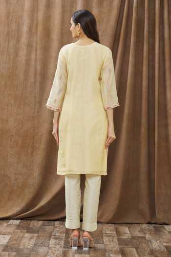 Beige Chanderi And Georgette Beads & Sequin, Thread Round Kurta Pant Set