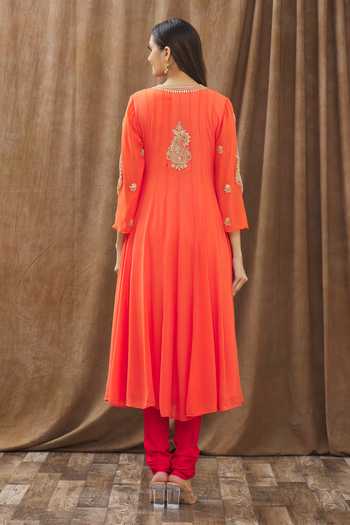 Coral anarkali with gold placement embroidered motifs and sequin work. Comes with churidar and dupatta.