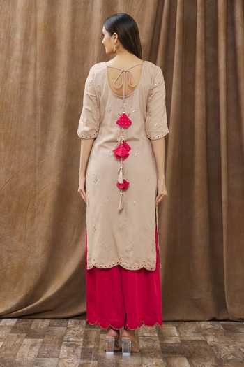 Brown kurta with floral embroidered motifs and scallop detail on the hems. Comes with red palazzo and dupatta.
