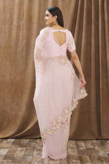 Blush pink organza saree with floral embroidered scallop border. Comes with blouse.