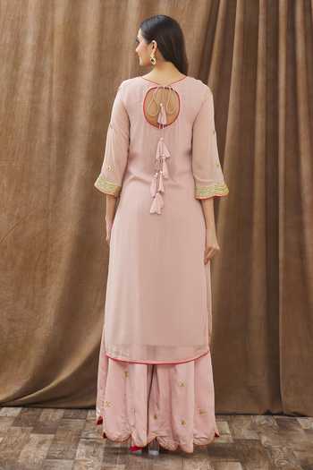 Old rose kurta with floral embroidered motifs and scalloped border. Comes with gharara and dupatta.