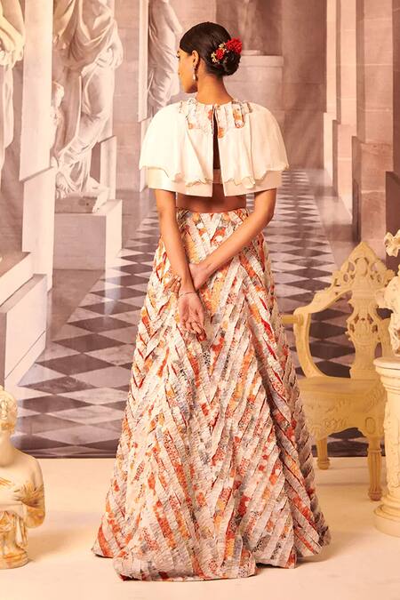 Multi color lehenga featuring a chevron pattern with attached can-can. Paired with an off white cape blouse with round neckline and cape sleeves.