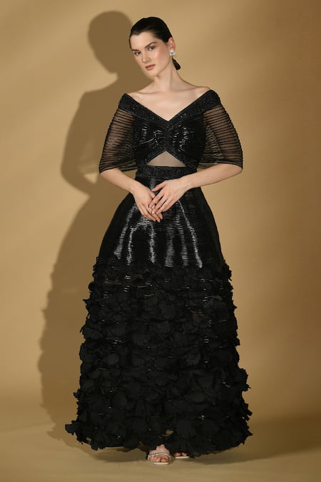 Buy_Geisha Designs_Black Nylon 3d Flowers Broad And Brigitta Pattern Structured Gown  _at_Aza_Fashions