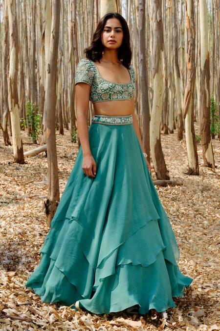Teal layered skirt style lehenga in organza base. Comes with floral embroidered blouse and dupatta.