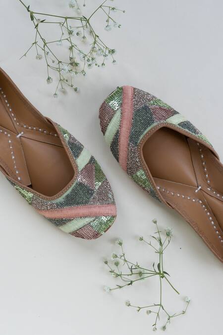 Green juttis featuring geometric patterns with thread sequins and cutdana