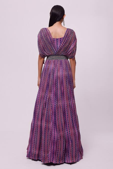 Purple gown with bead, geometric embroidery & pleated detailing.