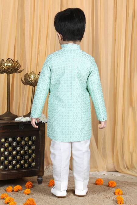 Sea green sherwani with geometric embroidery. Paired with kurta & slim fit pyjama.